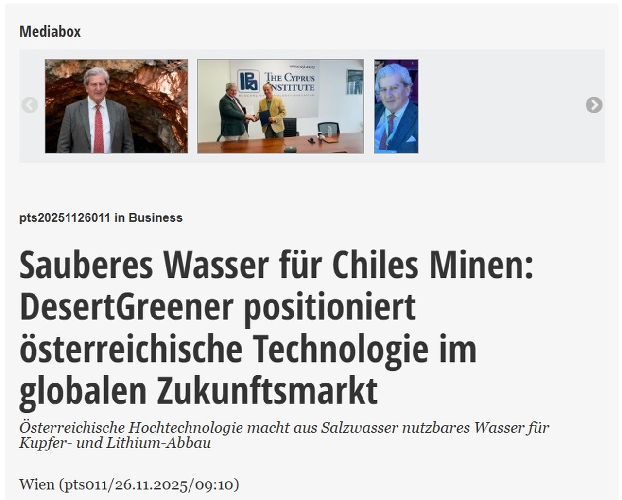 Global water scarcity is becoming an existential challenge – especially for water-intensive industries such as mining. DesertGreener, an Austrian CleanTech company, is starting industrial scaling with its solar-powered desalination technology and offers Chile a transformative solution: With heliotropic solar towers, DesertGreener will be able to turn seawater into high-purity freshwater through evaporation and condensation in the near future. Environmentally friendly, sustainable, CO2-neutral and scalable. A test plant is currently being built at the PROTEAS research campus together with the Cyprus Institute. The Austrian company will then start the next stage of its development: preparing the first large-scale commercial plants. Because the world needs water.